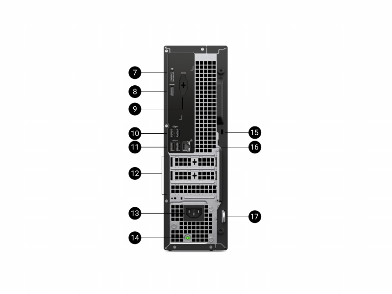 - Dell Pro Slim Essential : Przód - | 2 porty USB 2.0 | 1 port USB 3.2 pierwszej generacji | 1 port USB 3.2 Type-C® pierwszej generacji | 1 gniazdo zestawu słuchawkowego | Tył - | 2 porty USB 2.0 z funkcją SmartPower On | 2 porty USB 3.2 pierwszej generacji | 1 złącze DisplayPort 1.4 | 1 port HDMI 2.1 (TDMS) | 1 port Ethernet RJ45 | 1 port szeregowy (opcjonalnie) |